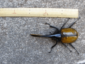 続きです。中ケース飼育ではヘラクレス、リッキー共に140mm以下は出ていませんが、小ケースだと130mm代も出てきます。特に♀を中ケースで飼育すると比較的簡単に70mmを越えて来ています。最大は幼虫時98g、成虫で78mm(頭を下げて胸と腹部をキツキツに詰めた状態で上羽根後端まで)でした。頭を上げれば80mmは余裕で越えていたと思います。