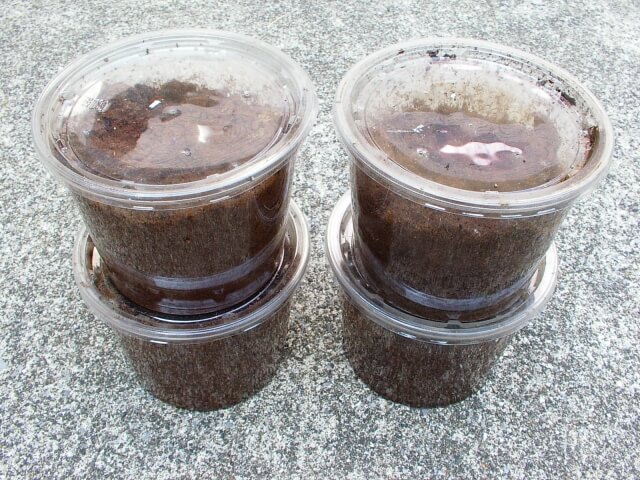 ①孵化した幼虫は大型のプリンカップ(860cc)に入れる。