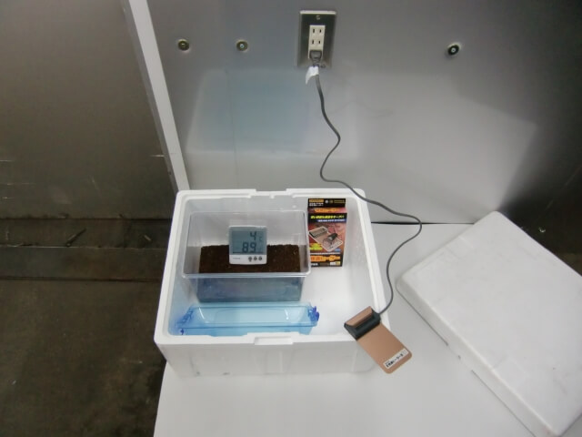 このように発泡スチロール、ケース(今回はクリーンMケース)、温度計、ヒーターを準備します。