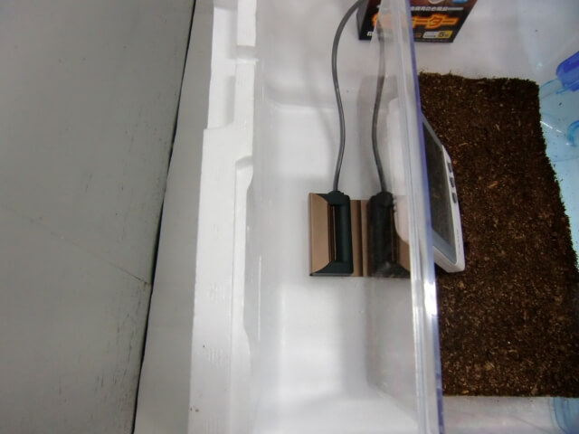 このような方法でしようします。この程度の温度上昇率ではこの空間ではちょっと厳しいかもしれません。 もっと小さめの空間でSS~Sサイズ程度のケースならばもう少しは温度も上がるかもしれません。 多くを飼育している方にはちょっと向かないというのが正直な所です。ご参考までに・・・。