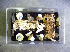 今回紹介しました個体はElement1100を使用しました。 ♂は1本目をまるまる喰いきり、菌糸の白い部分が約9割り程なくなった時点で2本目に移行。2本目も7~8割は白い部分がなくなりました。 ♀の方は1本目を約7割ほど食いきった状態で交換。2本目に交換すると2~3割食べた状態で暴れが始まり、そのまま蛹室を形成。その後蛹化~羽化となりました。