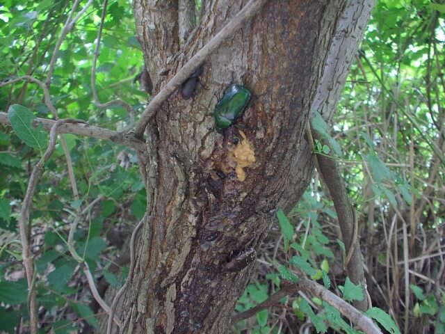 樹液が出ている樹です。ツタの隙間にクワガタの影が見えます。他はカナブンなどがちらほら・・・。