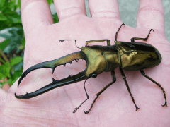 飼育自体は非常に容易です。あくまで私の飼育方法ですが、私は菌糸ではなく、マットで育てています。初令幼虫をまず広口600ビンに入れて約5ヶ月ほど管理。その後羽化の事も考えて私の場合は♂はPP1100ccの空ボトルに投入します。管理温度は大型を狙って少しですが低温で管理しました。サイズ的には全然ギネスには及びませんが、それでもこのサイズになると結構迫力があります。