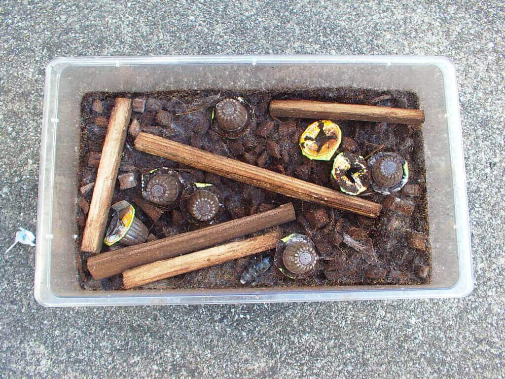 今回の産卵セットはもマットのみ(黒土マット)した産卵で行いました。産卵設定温度は本土産ミヤマに合わせて少し低めに設定しました。 18~20℃程度の温度帯でキープするように頑張りました。本土産ミヤマを産卵させるかどうかは、この低温管理がカギとお言っても過言ではありません。特に重要です!