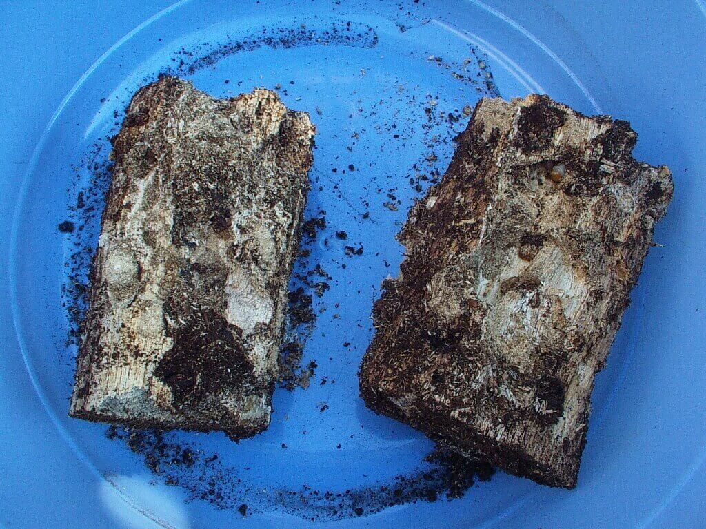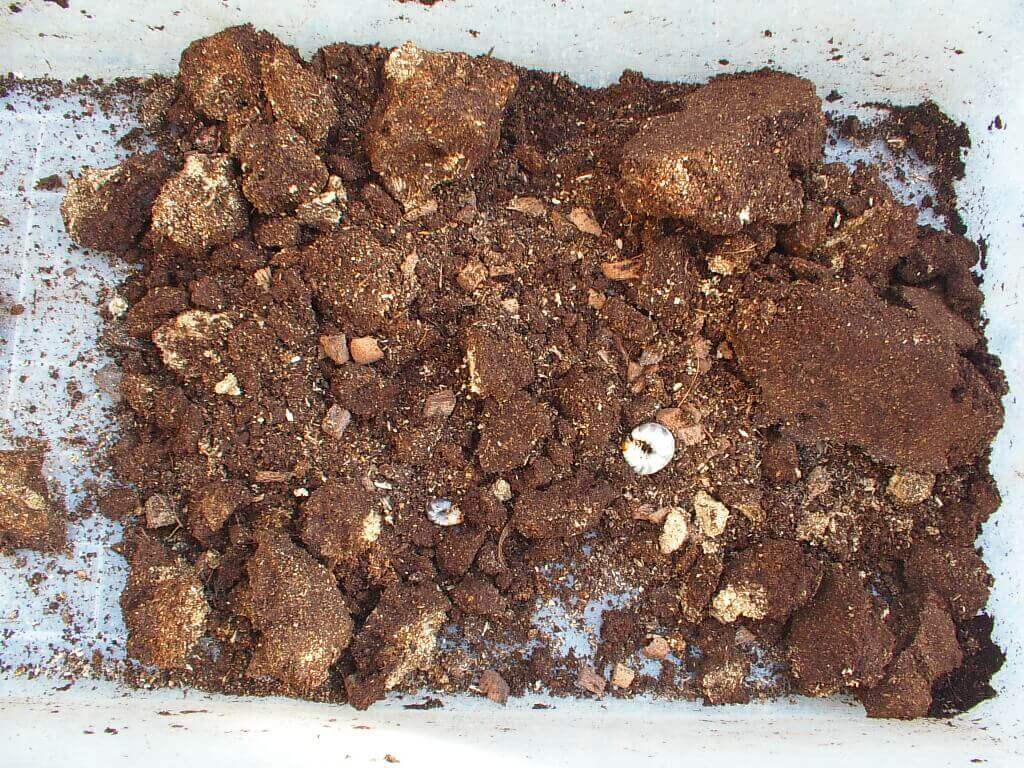 今回の産卵セットもマット+材を使用した産卵で行いました。材にもマットにも幼虫が確認出来ましたが、どちらかとうと材の方に多く入っていました。 卵は全て材より発見したので、材の表面近くで孵化した幼虫が食していく内にマットの方に移行したのではないかと推測しております。