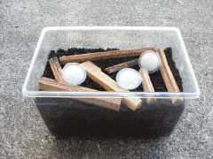 但し材全てに産卵していた場合は材に入り込んでしまっているので外側からは幼虫が確認出来ません。その場合は2ヶ月ほどして一度材を掘り起こしてみて下さい。材に産卵の形跡があればそのまま割り出しを行ってもよいと思います。