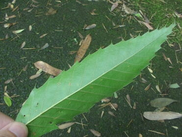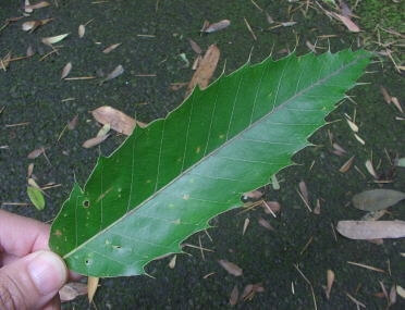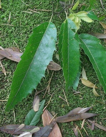 クヌギの葉っぱの表側です。細長く表は光沢があります。葉の周りは尖っています。