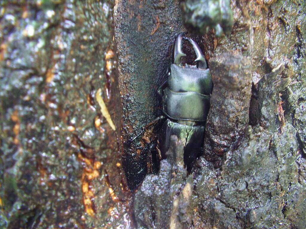 など小型ばかりでしたが、その他にもコクワ♂、♀など一気に6頭のクワガタがバラバラと雨のように落ちて来ました。いわゆるクワガタシャワーです。この瞬間はとても嬉しいですが、と同時に採集する方にとってはとても難しい瞬間となります。