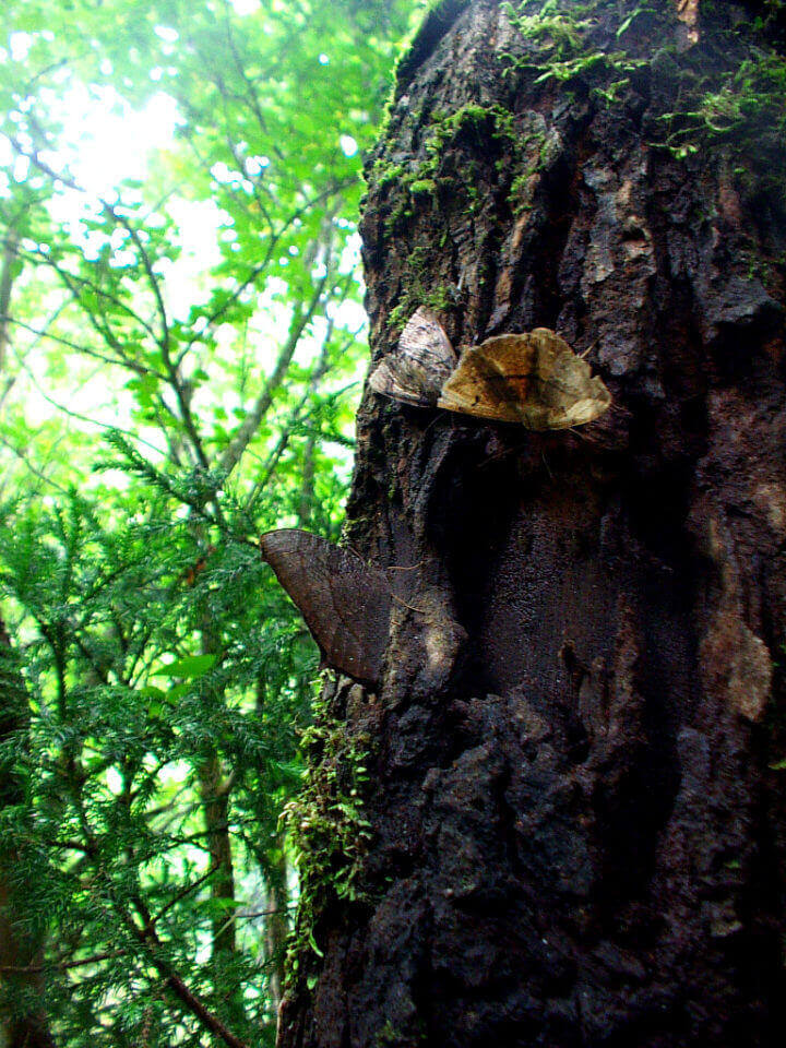 最初のポイント樹の樹液が出ている箇所を見てみると、クロコノマチョウ、スズメガ、その他不明蛾が樹液をお食事中でした。樹液は蝶達にもご馳走のようです。