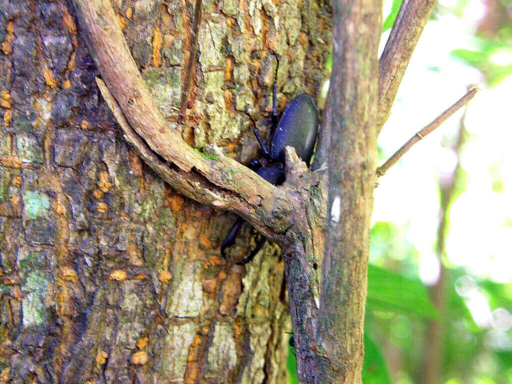 樹皮とツタの間に隠れているスジクワガタ♂