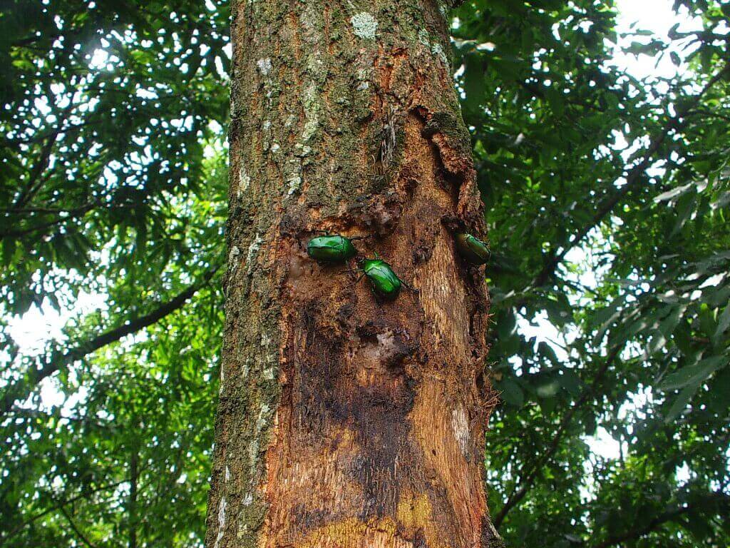 こちらの細いハルニレの木にはカナブン、アオカナブン、コクワガタ♀、蝶が集まっています。真ん中のひときわグリーンが強いのがアオカナブンです。他のカナブン達と比べて体のラインが細長いのが特徴の一つです。
