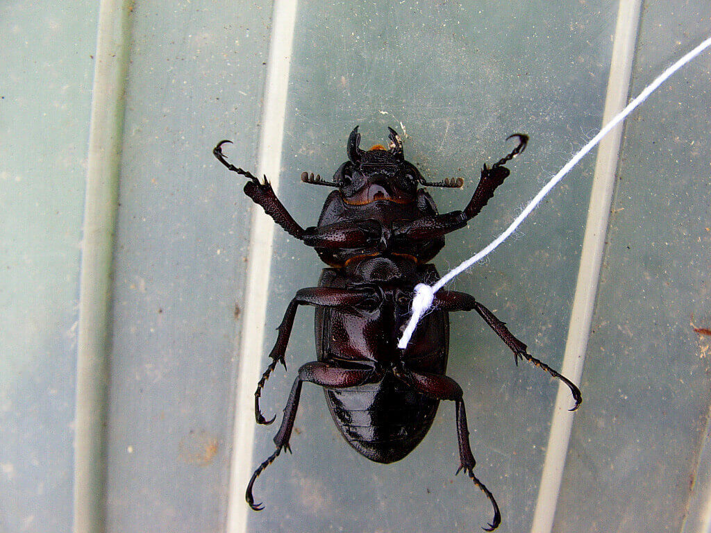 クワガタの♀の足に糸をつけ、逃げられないようにして、♀につられて来る♂を捕まえる