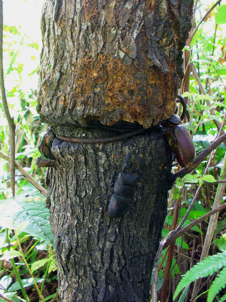 巻き付けられた木はそのまま成長し、その接合部分から樹液が染み出ているようです。そこにクワガタ達が集まって来ていました。