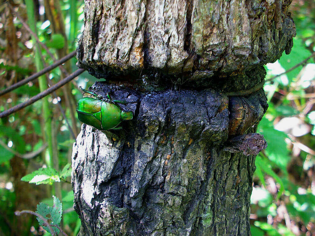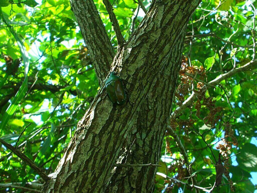 同じ木の上部分を見上げると、カナブンが枝から染み出ている樹液を舐めていました。