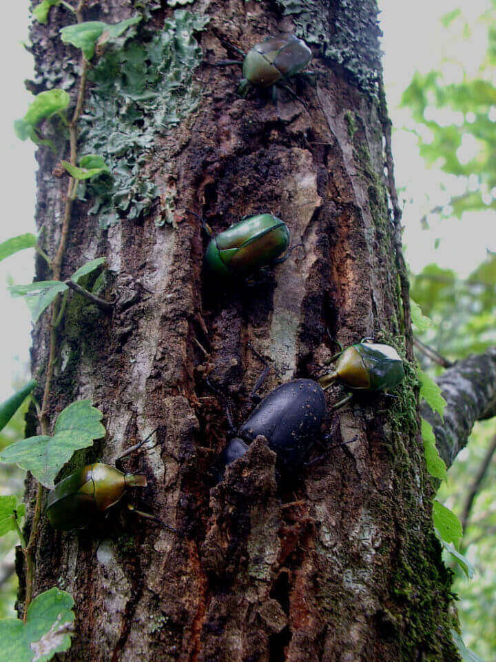 樹皮に頭を突っ込んでいる、おそらくヒラタクワガタと多数のカナブンが集まっています。