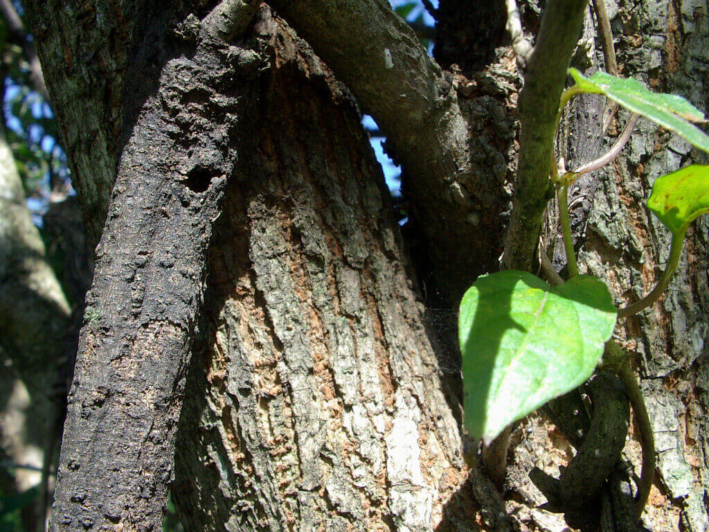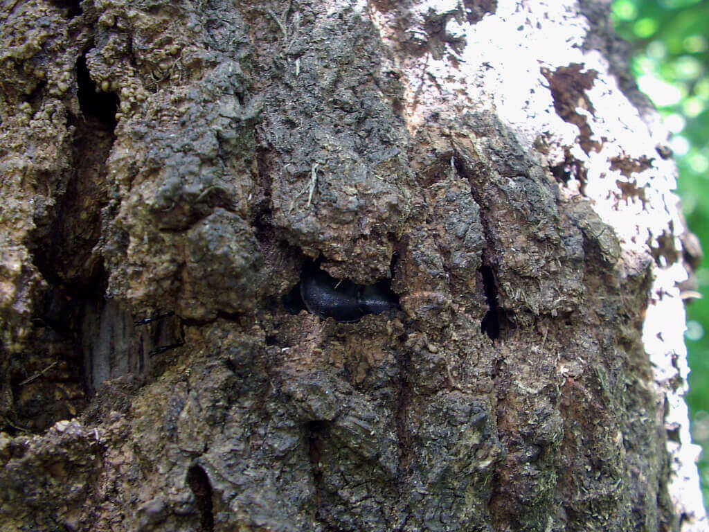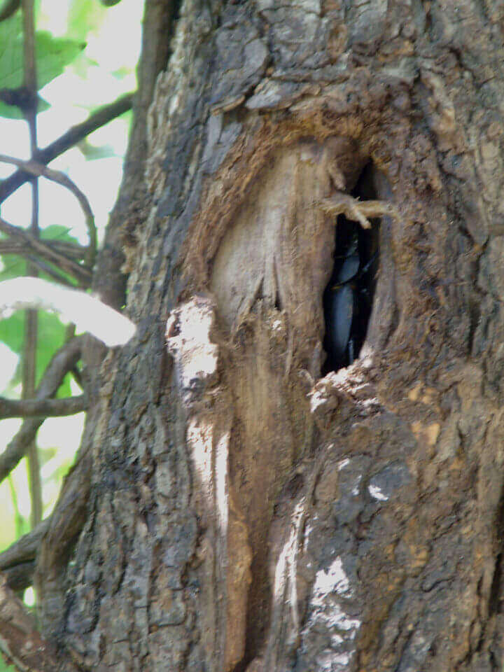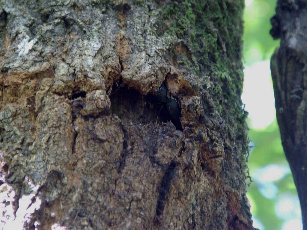こちらのクヌギの樹皮裏に、黒いものが見えました。