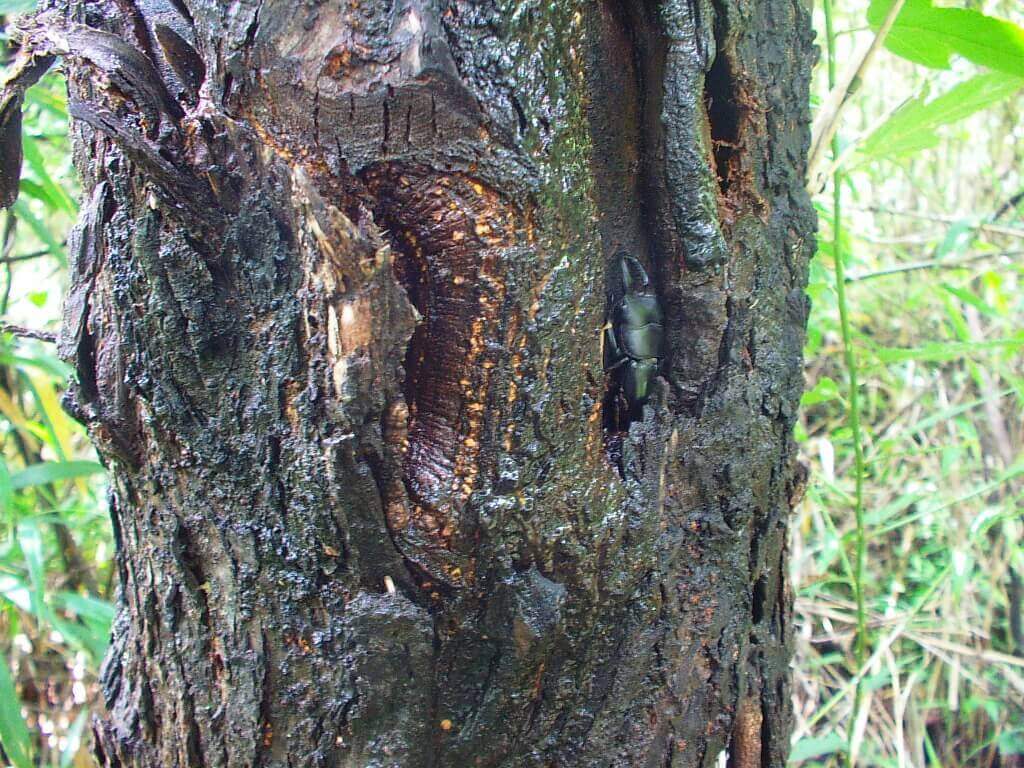 上記画像は人の手が加わって形成された台場クヌギではありませんが、クヌギのウロ(穴)。中からはしっかりと樹液が出ています。こいいう場所にウロ(穴)を好んで潜むオオクワガタやヒラタクワガタ、コクワガタが入っている場合が多いです。