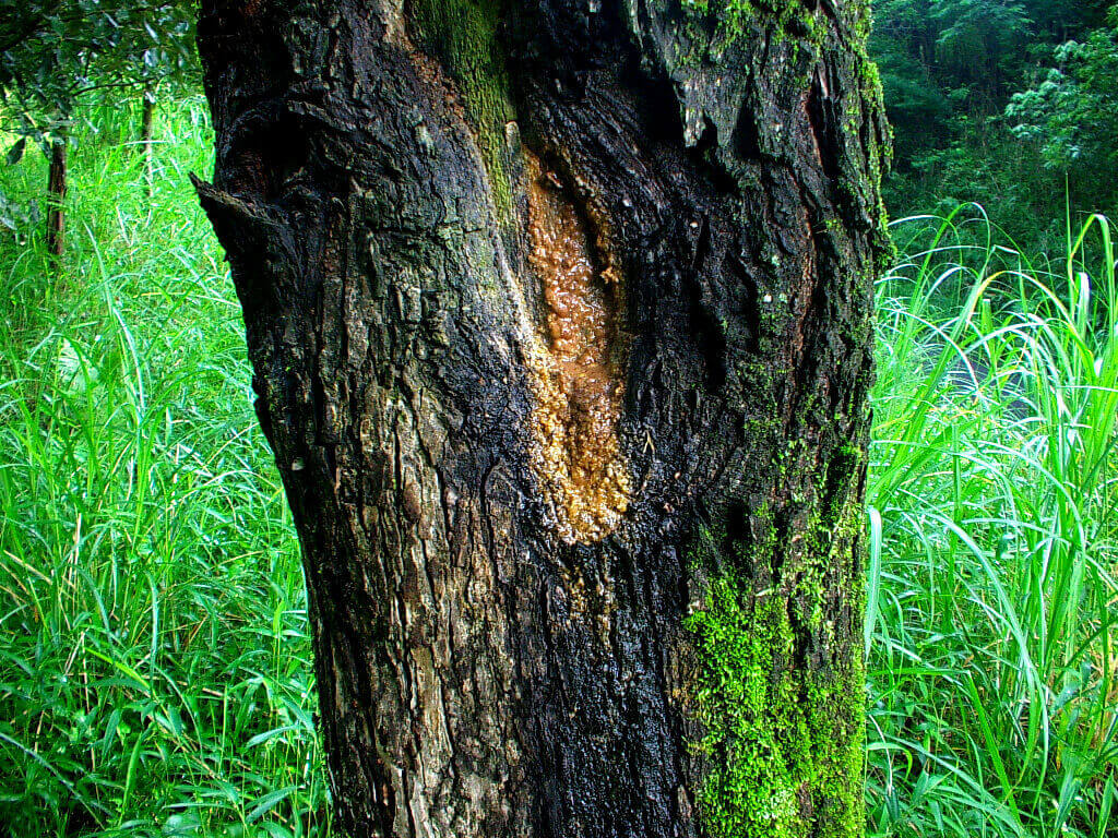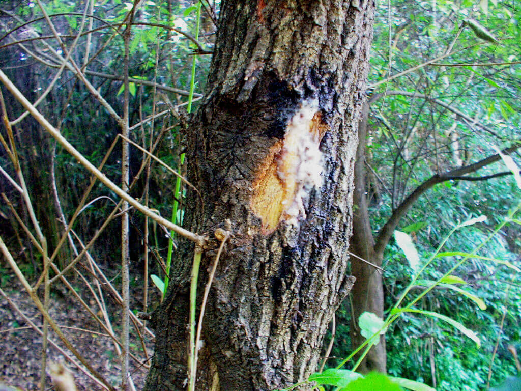 樹皮表面はゴツゴツとしていて、肉厚。樹液も濃厚で、発酵するとかなり強めの甘酸っぱい発酵した臭いがします。この木が流す樹液は強烈で、遠くまでかなりの臭いがします。
