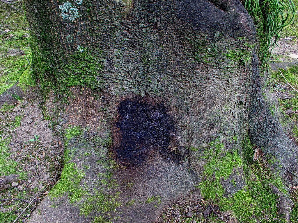 木の根元部分から樹液が出ているシラカシの木