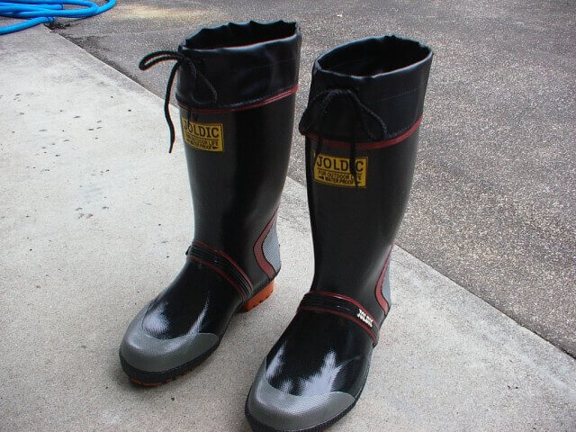 長靴。草むらには様々なものが潜んでいます。その代表格がヘビの「マムシ」です。近づいた覚えがなくても気づかずにそのテリトリーに入ってしまって攻撃を受けてしまう例は数えきれないほどあります。そういった意味でも長靴は必需品です。この画像の長靴はひざのすぐ下あたりまでくるタイプです。でもいくら長靴をはいているとはいえ、注意は絶対必要です。襲われないことにこしたことはありませんからね。
