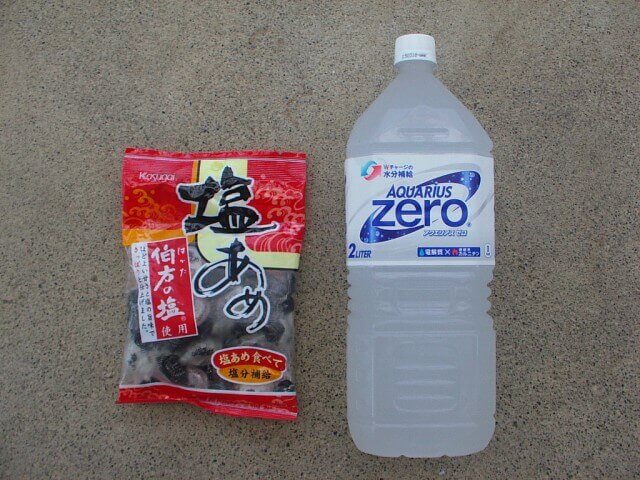 野外採集に行くときには、必ず水分補給や塩分補給が必要になります。日本の夏は30℃をも軽く超える炎天下になります。野外採集はとても楽しく、夢中になり気がつかないうちに水分や塩分がどんどん失われていきます。それらが不足してくると熱中症などを引き起こす原因にもなりますので、注意が必要です。こまめな水分補給、塩分補給を心がけるようにしましょう。