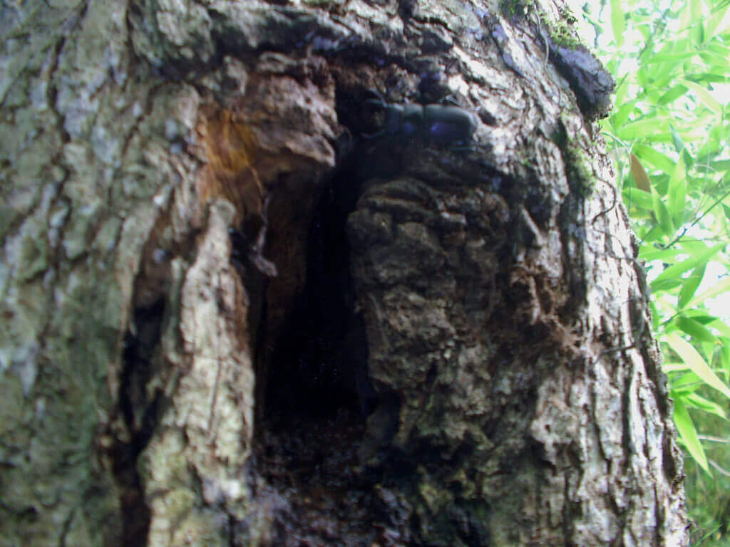 素早くウロ(穴)に逃げ込もうとしているクワガタを発見。