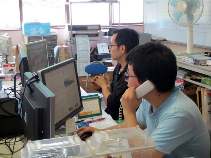 事務所内でもくもくと仕事をこなすスタッフ:本田氏(左)、御園生氏(右)。
