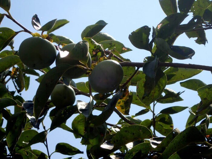 カラスウリ同様にまだ熟していませんが、秋の風物詩、柿の実もたわわに実っていました。