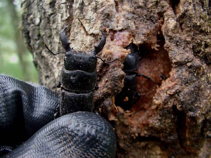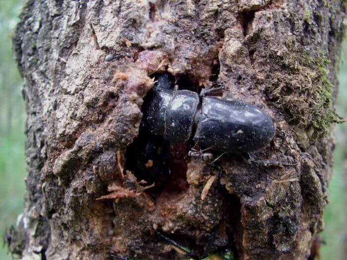 小さなウロ(穴)があり、その中に黒色のクワガタらしき姿が見えました。