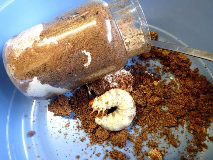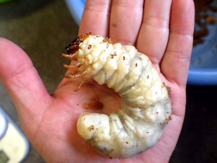 次に交換する(現在幼虫がいる)菌糸ビンの中にいる幼虫を取り出します。