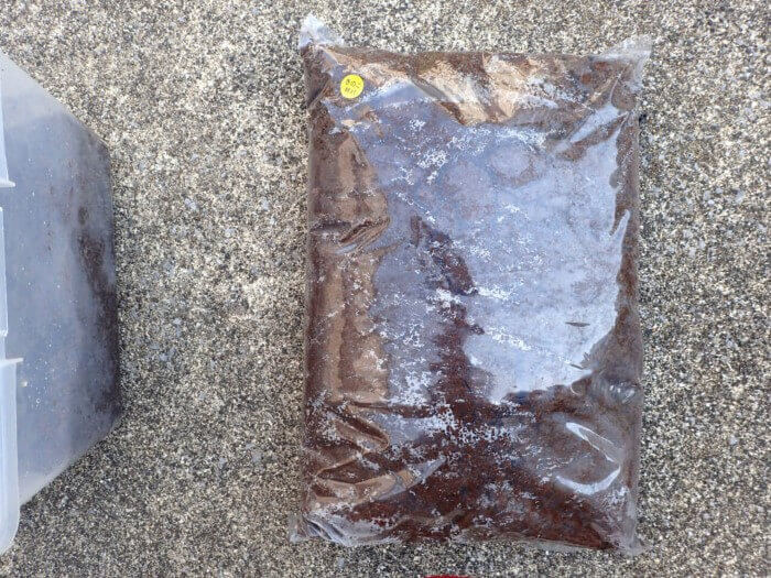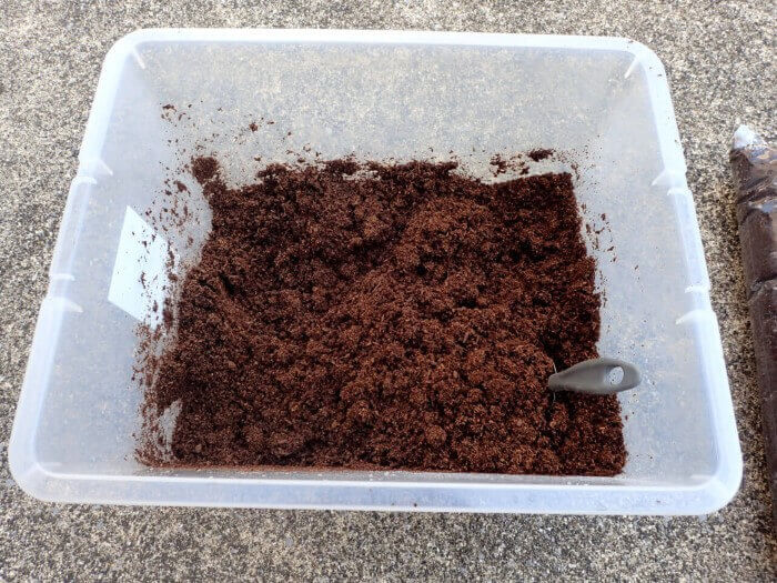 まずは、きのこマットを大きな容器に出し、水分が足りないようならば加水調整します。