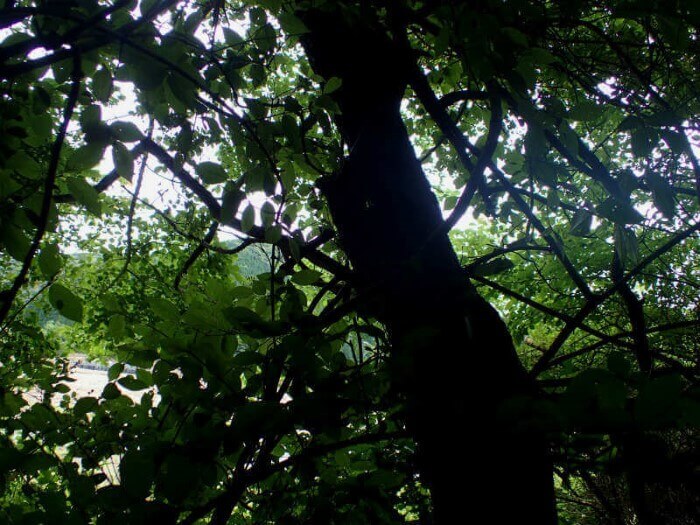 薄暗い林の中にあるハルニレの木。