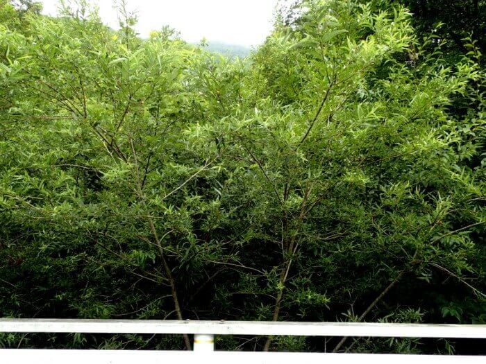 道沿いのガードレールの下の方から伸びたヤナギの木。