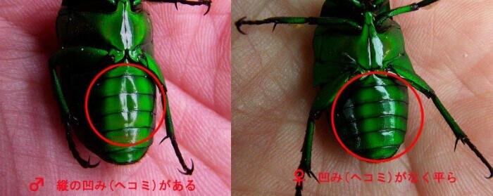下に国産アオカナブンの♂と♀のお腹の部分の拡大画像を紹介しております。ご覧下さいませ。