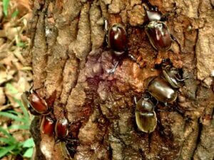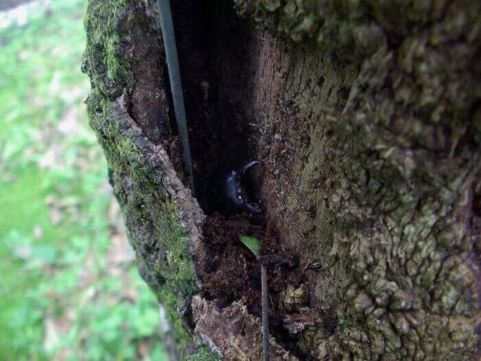 夏になると、こういった木からは傷付いた箇所から、甘酸っぱい臭いのする樹液が流れ出すものがあり、その樹液を目当てにクワガタ、カブトムシが集まってきます。