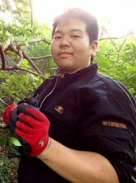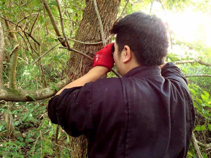 前日ヒラタ♂66mmが採れたウロをチェックするkazuくん。