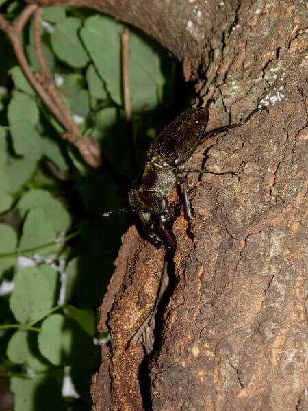 【ハルニレのウロから頭を出しているヒラタクワガタ♂】
