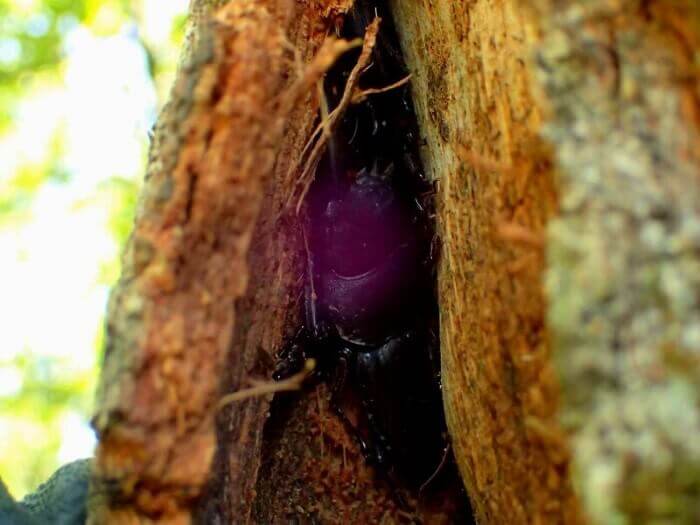 クヌギの木の樹皮裏に、