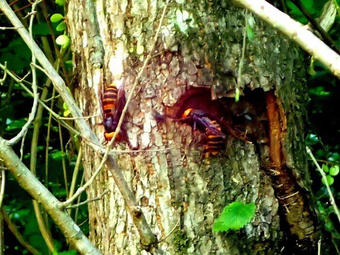 樹皮裏のチェックは諦めて、スズメバチが見えない反対側から、あまり刺激を与えないようにそーっと木を蹴ってみると、