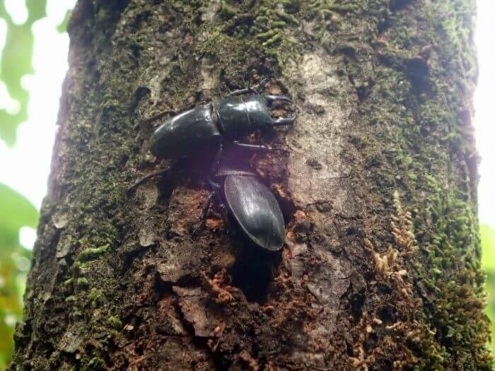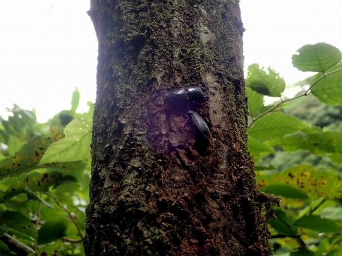 狭い樹皮裏の隙間に黒いクワガタを発見。