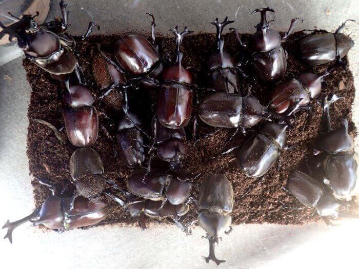 ライトトラップ用のシーツに着地したカブトムシの♀