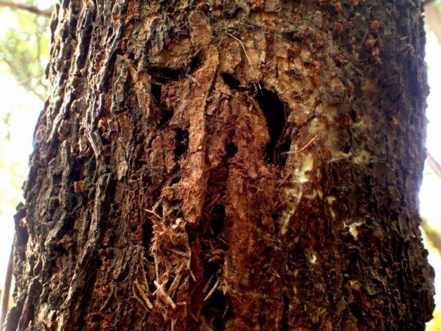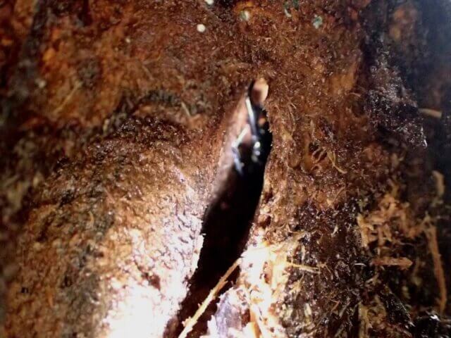 こちらのハルニレの小さなウロにクワガタを発見。