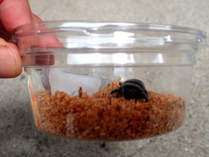 カットしたゼリーの半分を、成虫の待つカップに投入。