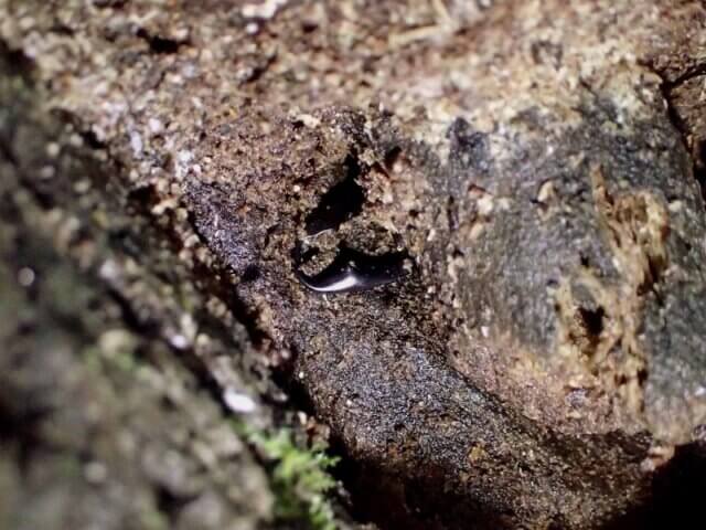 こちらの樹皮の隙間からは、細いアゴ先が見えます。