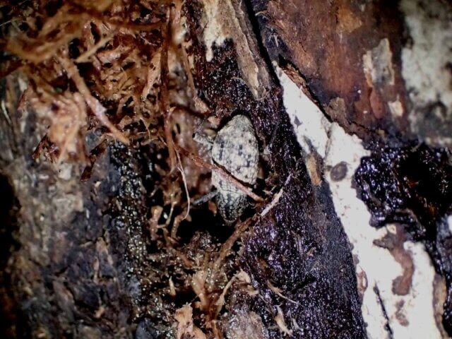 このゾウムシがいる画面向かって左側の樹皮裏には、