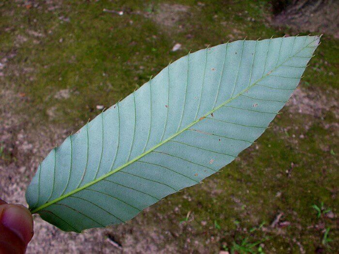裏側は微毛が生え、クヌギの葉と比べると白っぽい