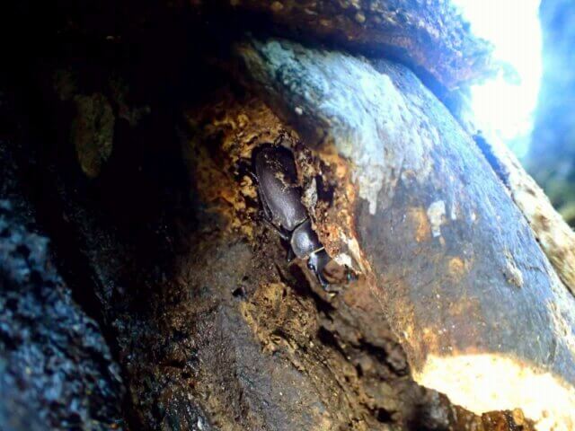 樹皮裏を覗くと、クワガタの姿を発見!
