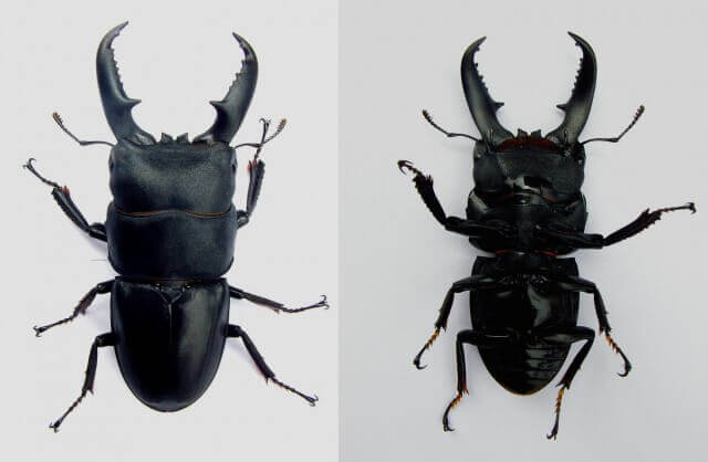 ただし♂の場合、個体の大きさによって、内歯やボディ(ミヤマのみ頭部突起)の形状が大きく変わります。
