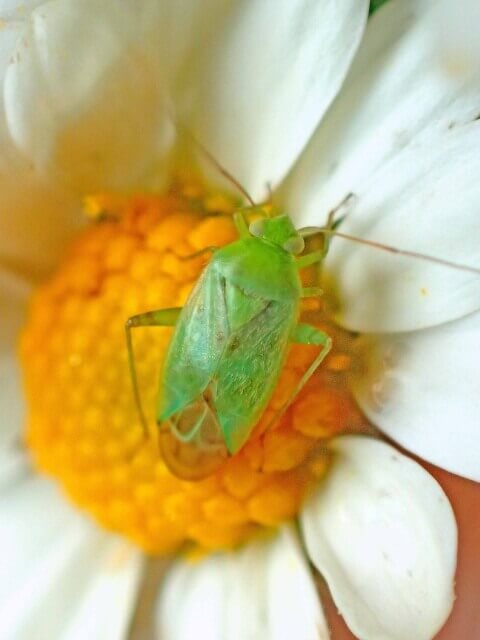 さっきのオレンジ色のカメムシとは違う緑色の体色がキレイなチャバネアオカメムシです。