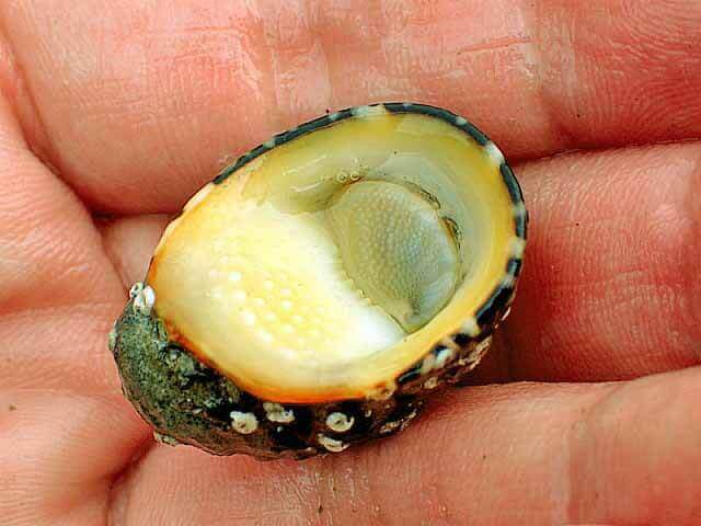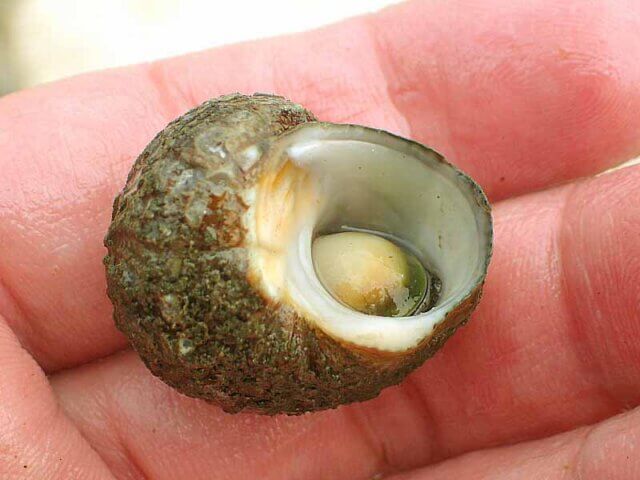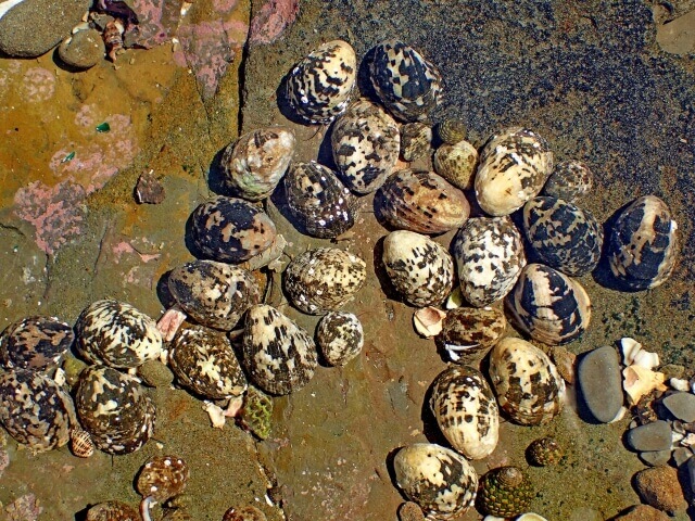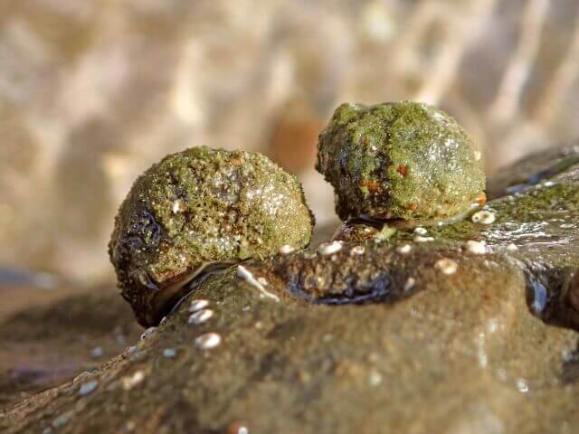 この貝は貝衣(カイゴロモ)という緑色の海藻に覆われているのですぐに分かります。